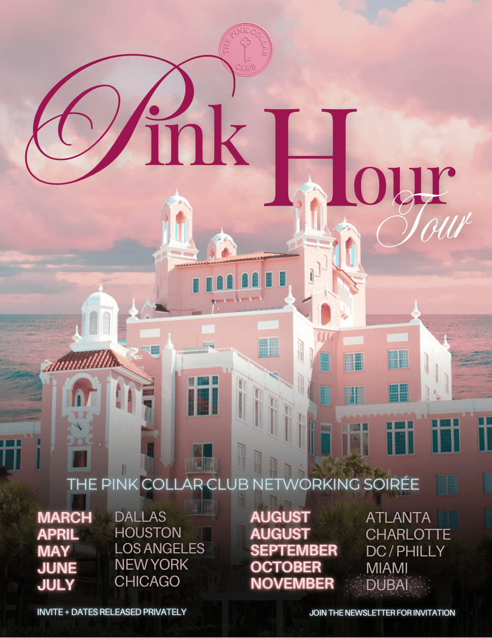 The 2026 Pink Hour Networking Soirée cities and seasonal windows have been released.
